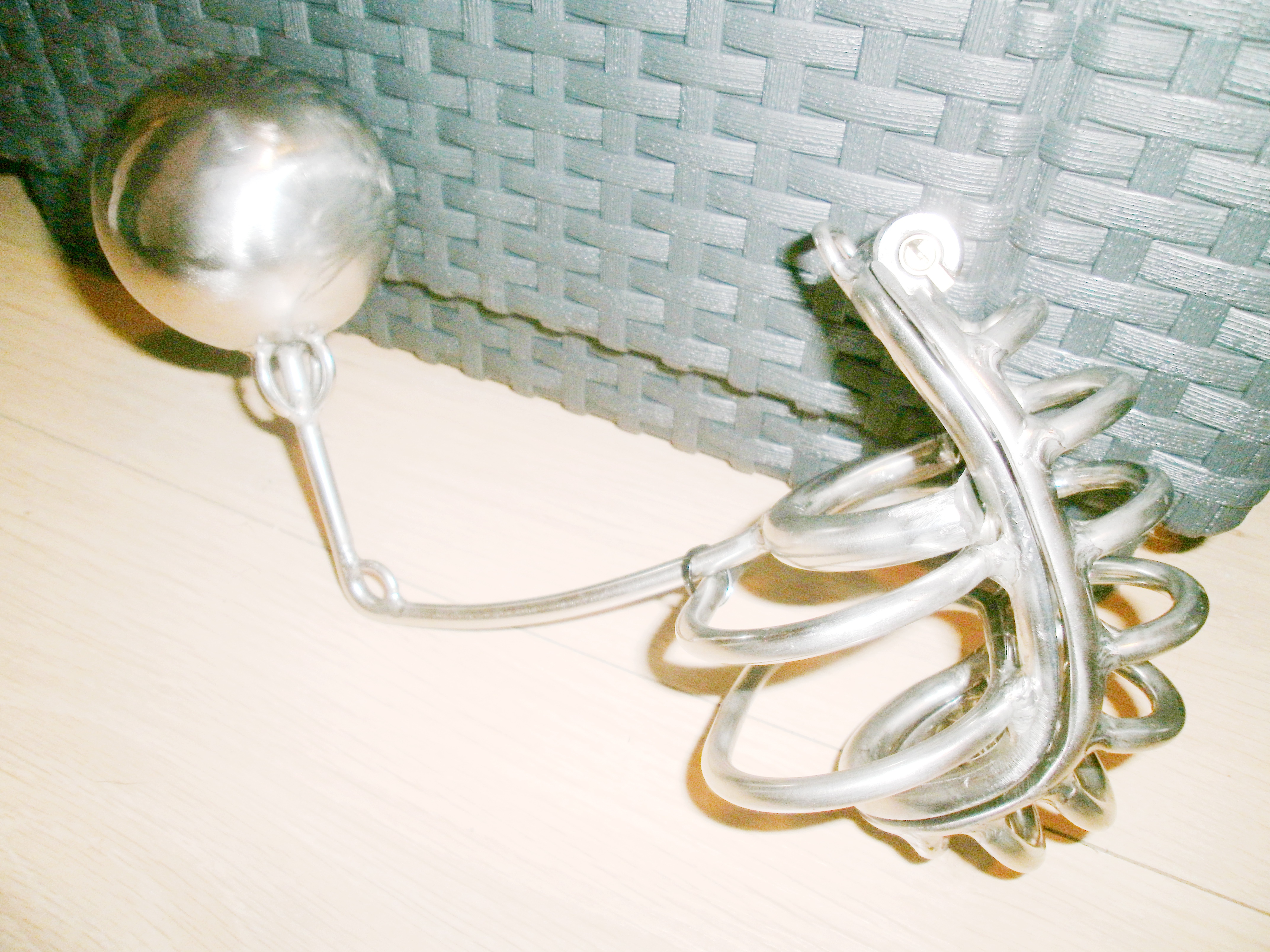 Deze kuisheidskooi is door mij zelf ontworpen en voor mij op maat gemaakt. Er zijn vier mogelijke manieren om hem te gebruiken. 1. Men plaats de anus bal 70mm in de anus, dan plaatst, de slavenballen in de kooi en sluit de kooi af, de anus en ballen zitten op slot, anus is onbruikbaar evenals de ballen 2, het zelfde als 1. Maar dan met de kap over de slavenpik deze kan ik de kooi nog een beetje vrij bewegen 3, het zelfde als 1. En 2, maar dan met de eikel, dwars door de eikel vast gezet aan de ballenkooi, dan de kooi er over afsluiten en alles zit op slot. 4, het zelfde als 3 maar dan zonder anusbal. Nu nog iemand die voor dat ik op slot ga eerst met mij wil spelen met mij als zijnde haar/ zijn slaaf. wil maken Amsterdam Almere t Gooi